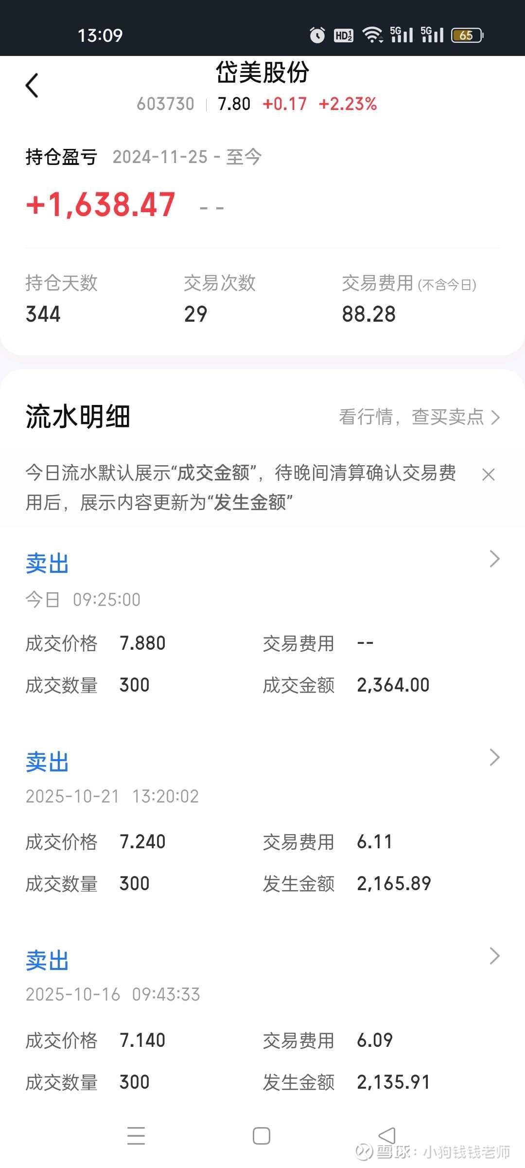 岱美股份,我今天在7.88元清仓,持有344天。共操作29次,盈利1638元。