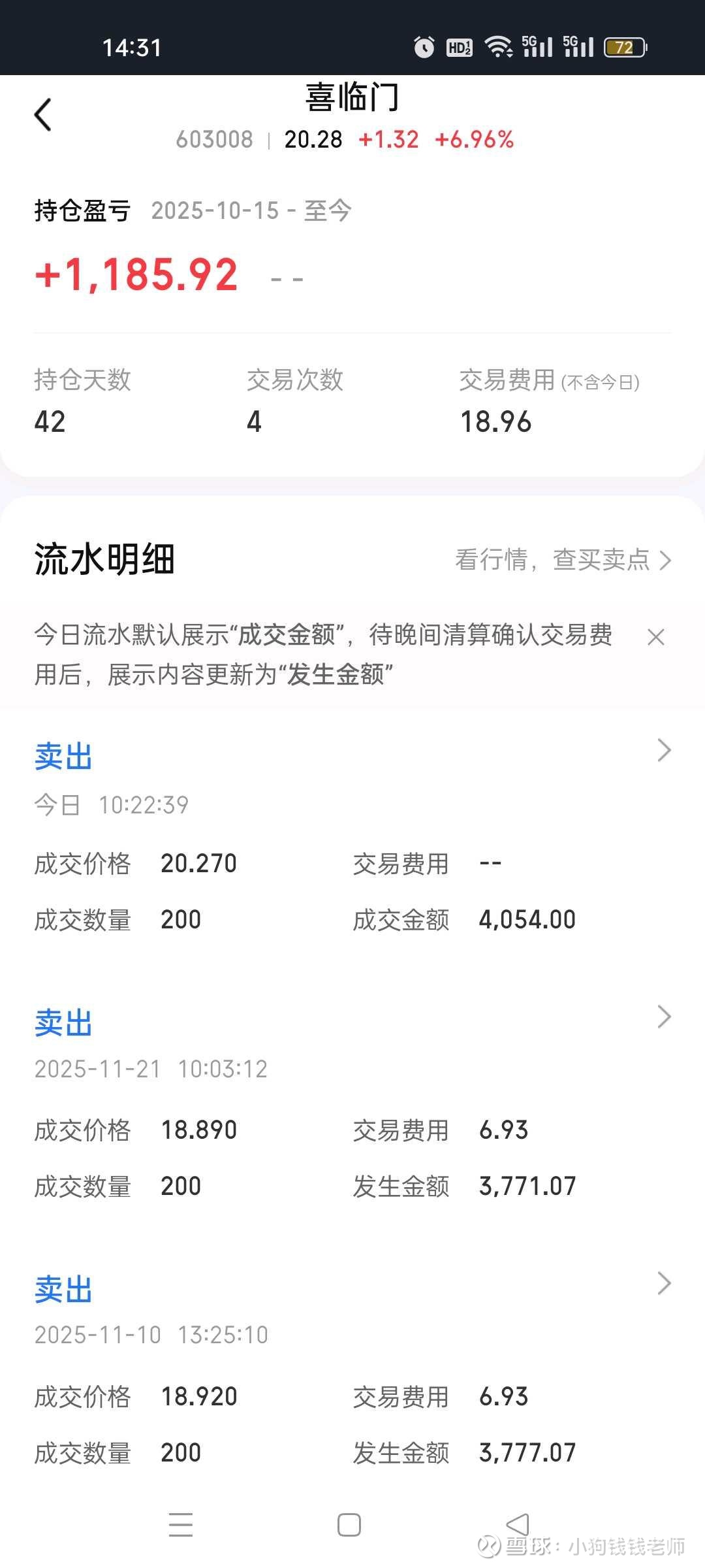 喜临门在10月15号开始买入,基本面非常不错,然后在11月10号开始卖出去第一笔,进入无风险仓位,上周五看大势不好,减了第二笔,如果留着可能赚更多。今天在20.27元清仓,盈利1100多元。效率挺高的。