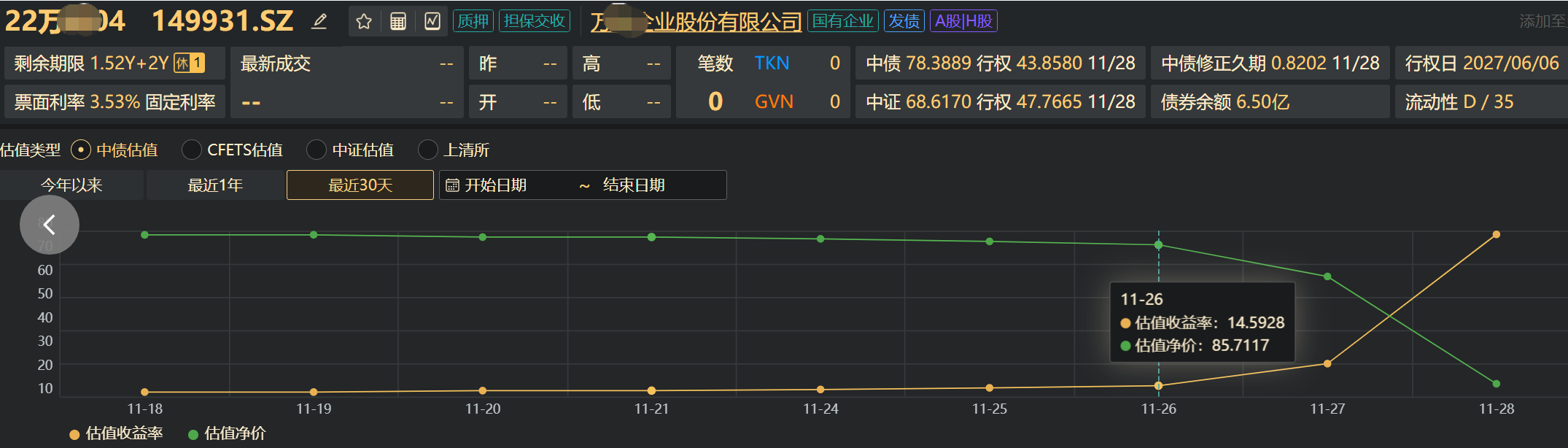 结合本周万科信用风险发酵背景,从11月25日开始万科多支境内债创下去年12月以来最大跌幅以来,26、27和28日三天,万科的债券总体是明显下跌的。尽管有一些抄底资金让部分万科债出现了反弹。但远不足以缓和市场整体对万科信用风险的担忧。下图是我随意选取的一个万科债(22万科04),图中可以看到26号以前的估值非常平稳,但2天后票面净值就完成了腰斩(从85元跌倒43元)。