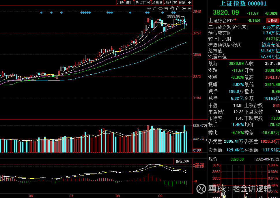 先说一个结论,市场并未按照我们预期加速冲高,叠加十一假期,老金和一些朋友交流,好多赚大钱的资金,准备休息一下,十一后再战,所以我们看到周五成交量从3万亿缩量到了 2.35万亿。
