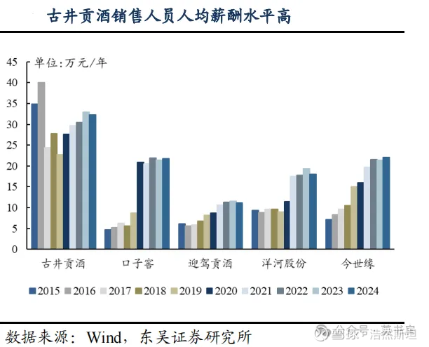 第三张图,是古井核心竞争力的底层支撑之一:薪酬体系。古井销售团队的人均年薪约 33 万元,遥遥领先行业内多数竞争对手,薪酬水平接近洋河的 2 倍、迎驾贡酒的 2 倍以上,其销售负责人的年薪更是高达 400 万元。这种极具竞争力的现金薪酬,相较于虚无的荣誉、远期的期权奖励,能更直接、更高效地激发团队的主观能动性,也从根本上保障了销售团队的凝聚力与战斗力。