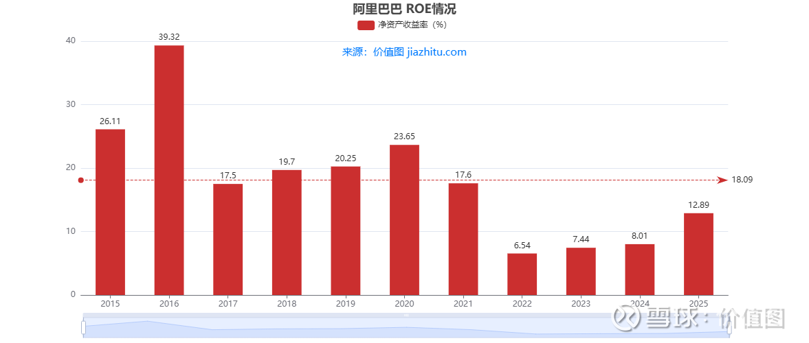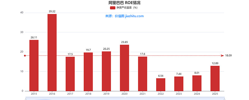 为啥会这样?说白了,前些年阿里疯狂搞新业务(比如云计算、本地生活、大健康),这些业务前期要砸很多钱,相当于 “净资产” 变多了,但新业务暂时没赚到大钱,所以 ROE 就被拉低了。现在新业务慢慢走上正轨,赚钱效率自然就回来了。