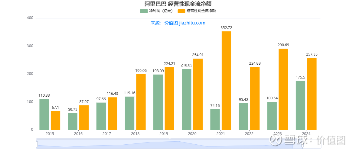 看阿里的现金流,太有意思了:2021 年,净利润才74.16 亿,但经营性现金流直接飙到352.72 亿!相当于净利润的 4 倍多。啥意思?那年阿里表面赚得不多,实际 “闷声发大财”,手里收到的钱比报表利润多得多。