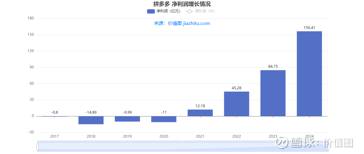 拼多多的净利润曲线,堪称 “逆袭爽剧”。2017 - 2020 年,它连续四年亏损,累计亏近 40 亿元,市场给它的标签是 “低价平台”“靠烧钱换用户”。但 2021 年成了转折点,净利润首次转正(12.18 亿元),随后一路狂飙:2022 年 45.28 亿元,2023 年 84.75 亿元,2024 年直接跳涨至 156.41 亿元,三年利润翻了 12 倍多。