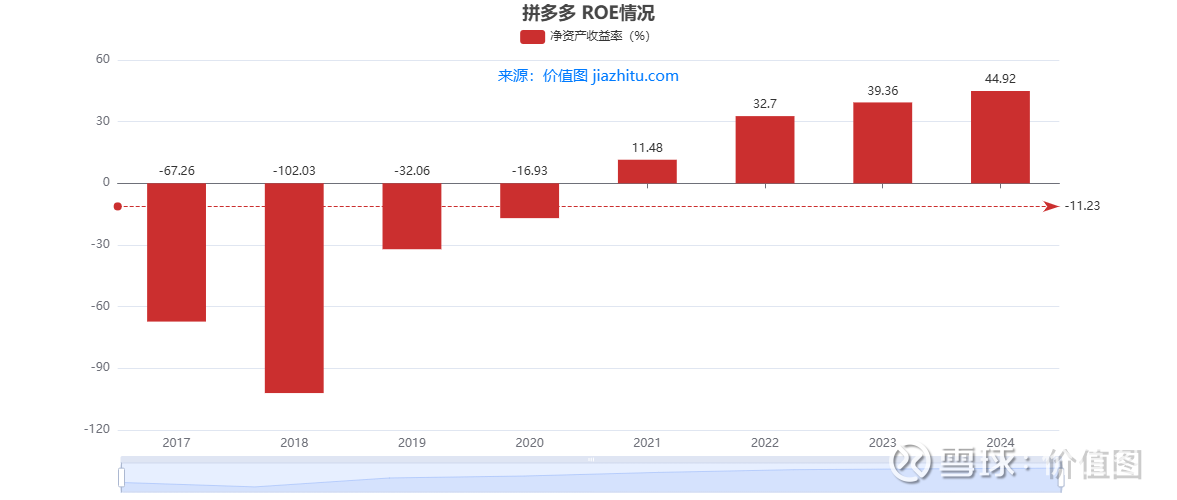 先看ROE(净资产收益率),这是衡量企业为股东赚钱能力的核心指标。2017 年,拼多多 ROE 为 - 67.26%,意味着股东投进去的钱不仅没赚,还亏了大半;但到 2021 年,ROE 成功转正(11.48%),2022 年 32.7%,2023 年 39.36%,2024 年更是冲到 44.92%。要知道,A 股 “盈利模范生” 贵州茅台,ROE 常年维持在 30% 左右,拼多多如今的 ROE 已反超茅台,足见其用股东资本赚钱的效率,已站到行业顶端。