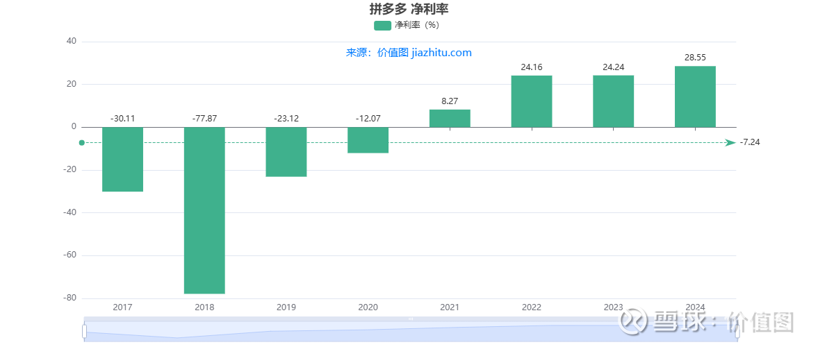 早年,拼多多净利率为负,被调侃 “赔本赚吆喝”,如今净利率却成了 “撒手锏”。2017 年净利率 - 30.11%,2021 年转正至 8.27%,2024 年直接飙升至 28.55%。要知道,电商行业净利率普遍不高,京东常年在 2%-5% 区间,拼多多能做到近 30%,堪比高端消费品牌。