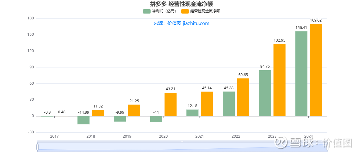 再看经营性现金流净额,这是 “盈利含金量” 的试金石。2017 年,拼多多现金流仅 0.48 亿元,2020 年才 43.21 亿元;但 2023 年骤增至 132.95 亿元,2024 年达 169.62 亿元,远超当年净利润(156.41 亿元)。这意味着,拼多多赚的不是 “账面利润”,而是实实在在收到了现金,经营效率与上下游话语权都在大幅提升。