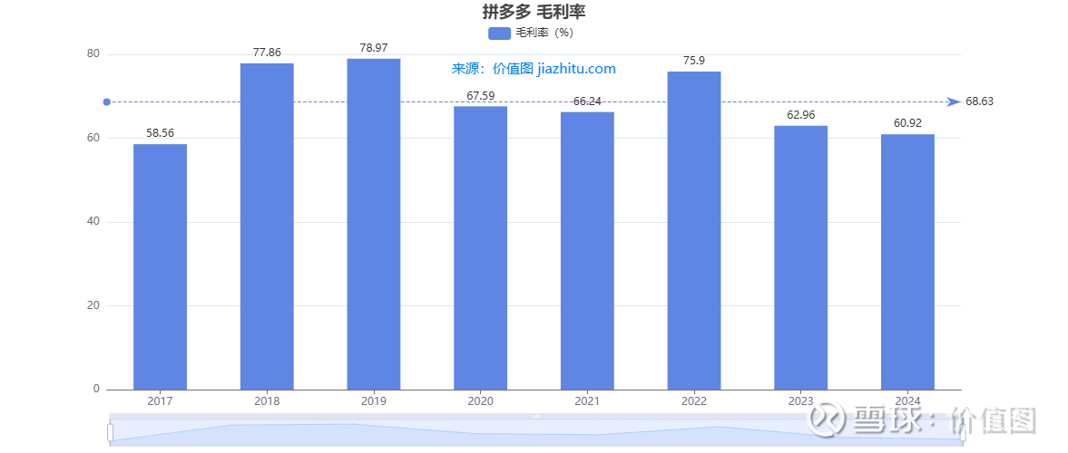 门道。拼多多毛利率从 2017 年的 58.56%,一路涨到 2019 年的 78.97%(峰值),后虽略有回落,2024 年仍达 60.92%。看似毛利率下降,实则是 “主动选择”:通过 “百亿补贴”“农货上行” 等策略,拼多多在保住毛利率基本盘的同时,用规模效应摊薄成本,再通过物流、供应链优化等运营效率提升,将更多毛利转化为净利 —— 这是典型的 “精细化运营” 成果。