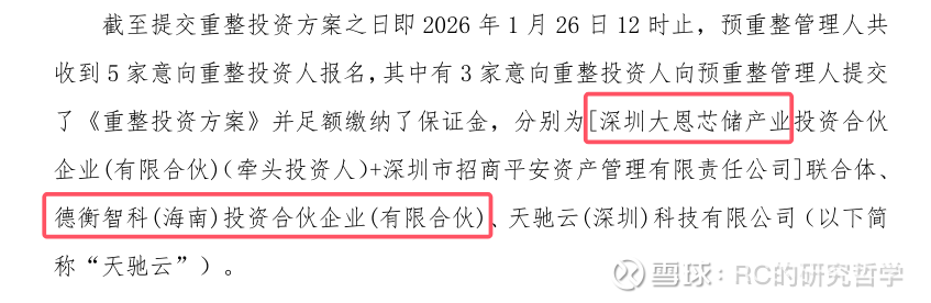 2家分别为[深圳大恩芯储产业投资合伙 企业(有限合伙)(牵头投资人)+深圳市招商平安资产管理有限责任公司]联合体、 德衡智科(海南)投资合伙企业(有限合伙);