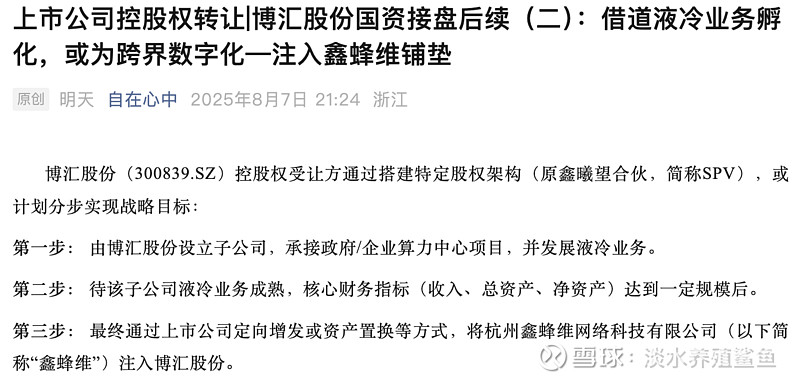 $博汇股份(SZ300839)$ 博汇马上就会变成正宗AI算力+液冷标的,看到300亿10倍空间。微信上搜到的一篇文章,结合近期的资本运作接下来应该是要开始资产重组把鑫蜂维注入进来了,从化工行业摇身一变变成AI算力,查了下鑫蜂维的股东关系实际绑定的就是阿里云,一年1000亿的资本开支分1/5给自己人不过分吧,200亿营收要给到多少市值?