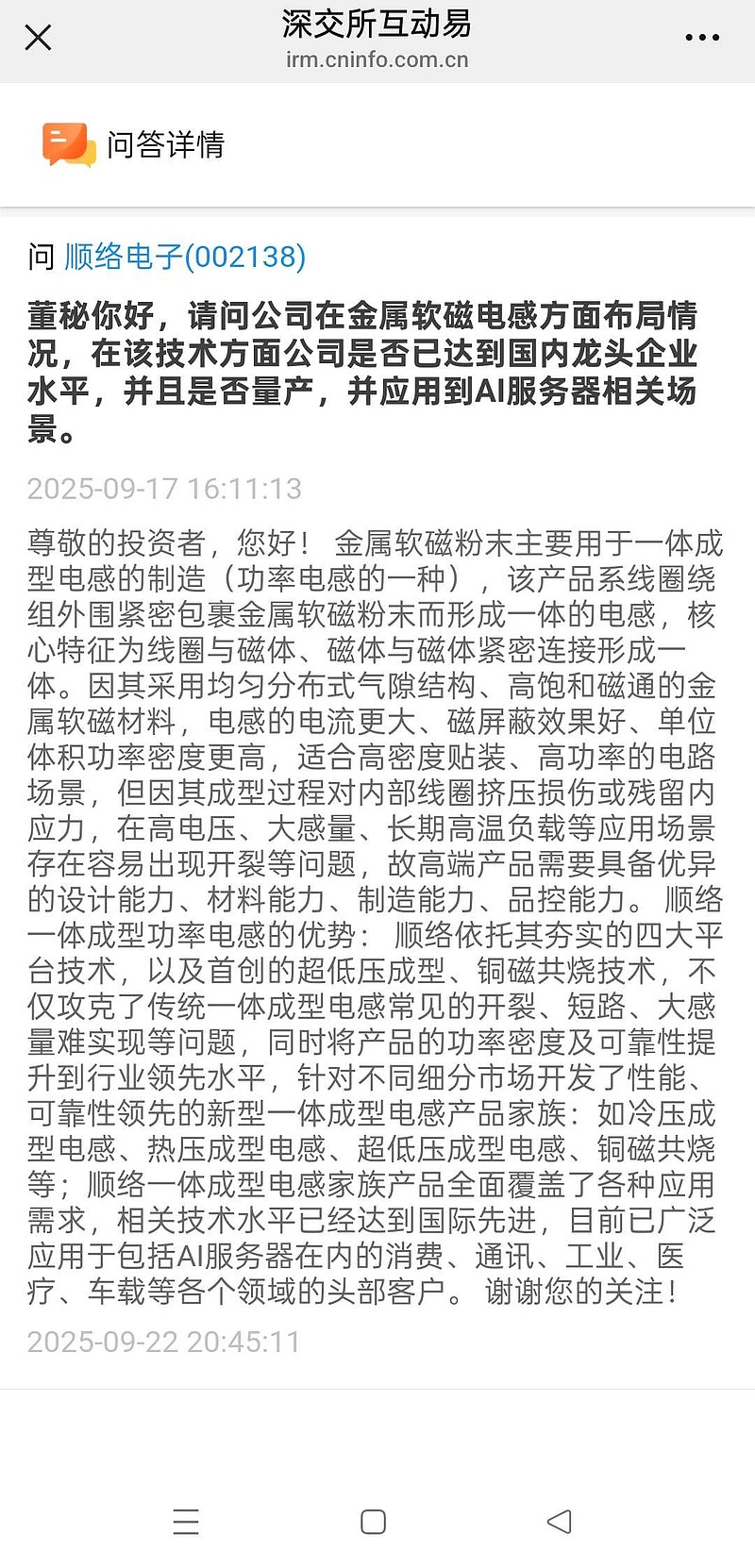 $顺络电子(SZ002138)$ 我问的这问题,就是想比较一下顺络是有金融软磁电感相关产品:该产品龙头是科创板$铂科新材(SZ300811)$ 深圳柏科的金融软磁电感,应用主要是高压环境如充电桩、光伏储能、服务器三大场景;董秘回复意思是:一体成型功率电感碾压金属软磁电感,是新一代技术,将在高压三大场景表现更优秀,请问行业球友是否属实?