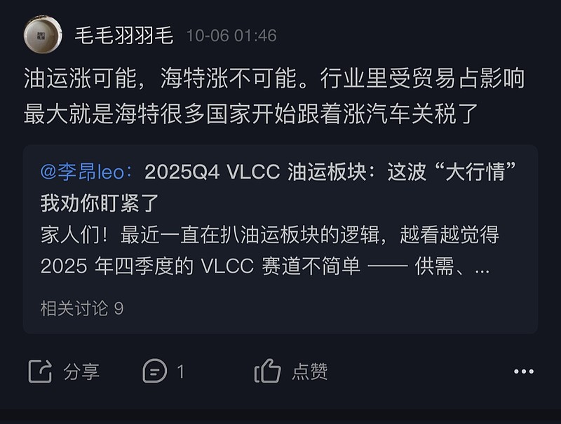 而且呢,所有被海特论坛x掉的帖子,就是你直接刷是刷不到的,你得手动搜才搜的到的帖子,毛毛羽都能看见,然后唱空,除非这人拉黑了他。这可不是我臆测,我自己就实测过,也有很多球友可以现身评论区说法,我观察他的时候就发现他评论唱空的许多帖子根本在下面刷不到,得手动搜才搜的到。 但只要你提到了中远海特,帖子被x了也没关系,他闻着味儿就来了,你只要不拉黑他他一定得高低唱空两句。