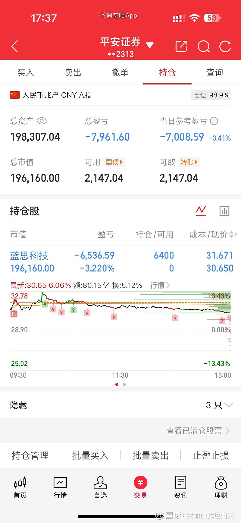 就算是20万本金起步吧、30岁的第一天、开启实盘之路、记录一下自己的交易生涯。没什么大的抱负、能赚点钱养家糊口已经是莫大的恩赐。第一天就被套了、满仓蓝思科技