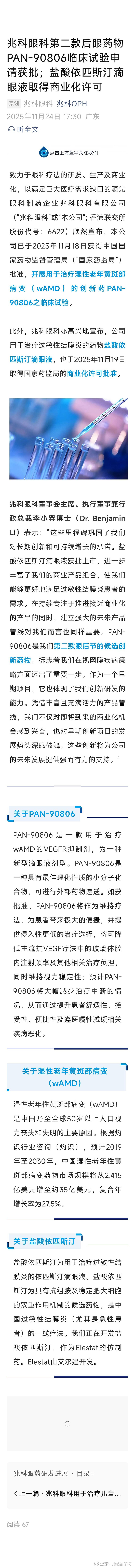 第二款后眼药物PAN-90806临床试验申请获批;盐酸依匹斯汀滴眼液取得商业化许可