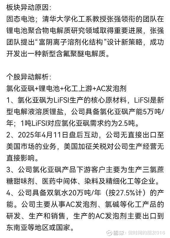 :氯化亚砜为LiFSI生产的核心原材料,LiFSI是新型电解液溶质锂盐,公司具备氯化亚砜产能5万吨/年;1吨LiFSI对应氯化亚砜需求约为2.5吨。值得重点关注!