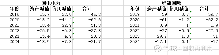 再看减值,资产减值无非几个因素,机组未来预期收益不达标、老破小机组关停、在建工程烂尾、高价收烂公司商誉减值。信用减值无非应收账款难收回,主要是补贴,其他应收款坏账,主要是借给合作伙伴或者子公司,结果对方破产了。这几年主要发电公司基本在疯狂计提,反正利润上去不,索性包袱卸下来。像国电、华能都非常激进,基本是应提尽提的在搞。下表是国电、华能的计提。