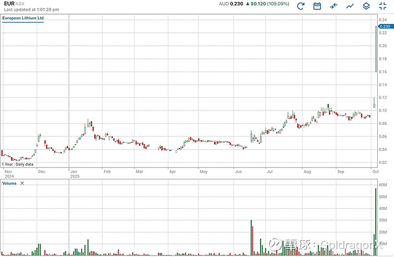 $Critical Metals(CRML)$ 澳洲上市的EUR持有CRML约70.4%的股份(截至2025年2月数据),受益于CRML美国政府入股预期,喜迎今天大涨,目前上涨109%,其旗下格陵兰岛Tanbreez稀土项目和欧洲的Wolfsberg锂矿项目都是对美国,对欧洲的关键矿产,后续值得继续关注。