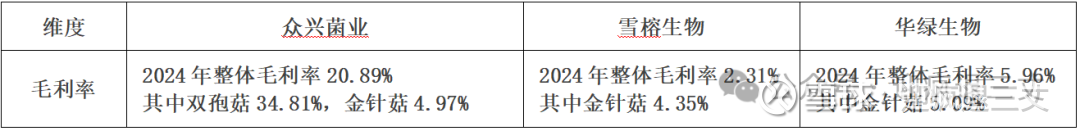 目前,国内食用菌行业主要的上市公司对手包括雪榕生物、华绿生物等。这是一个标准的种植行业,技术门槛、研发门槛都是很低的,你能做,我就能做,你能种,我也能种,比拼的无非是产品差异化、规模效应、成本控制等这些细活。同拉这三家公司的产品毛利率和整体毛利率来看。
