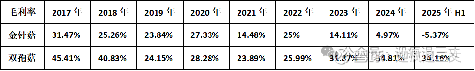 从上述表格可知,金针菇市场竞争激烈。参考众兴菌业、雪榕生物、华绿生物三家企业今年的毛利率均呈负数,市场已步入供大于求、竞争激烈的阶段。相较而言,双孢菇的竞争环境较为宽松,其毛利率在近几年始终维持在24% - 45%的区间内,中位数约为30%。