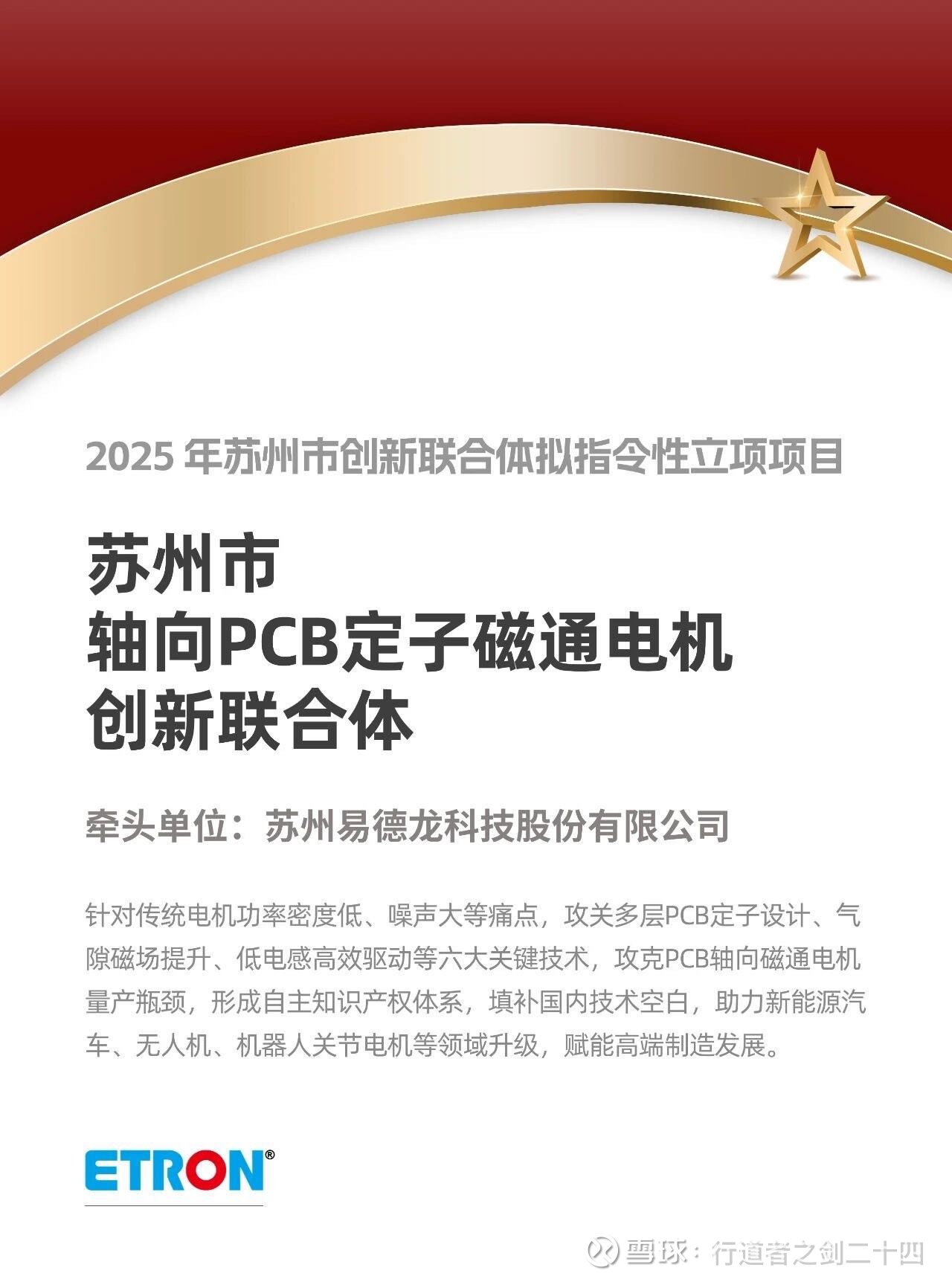 今晚官微发布重大利好!喜讯!易德龙牵头项目获市级创新联合体指令性立项苏州易德龙科技股份有限公司牵头的“苏州市轴向PCB定子磁通电机创新联合体”项目,入选为2025年苏州市创新联合体拟指令性立项项目。
