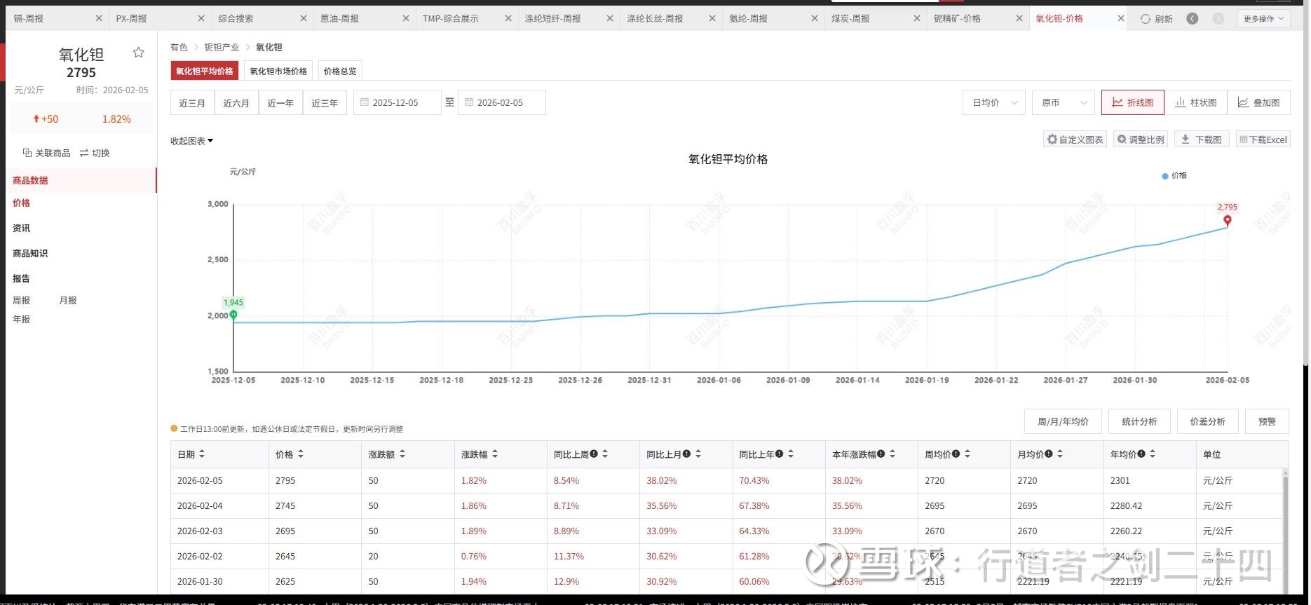• 价格端:你提供的图表显示,氧化钽价格从2025年12月初的约2000元/公斤,已上涨至2026年2月5日的2795元/公斤,涨幅近40%。