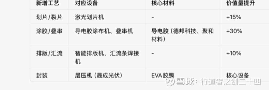 叠瓦工艺相较传统产线,主要新增划片、裂片、涂胶、叠串、排版、汇流条焊接等工艺及相关设备: