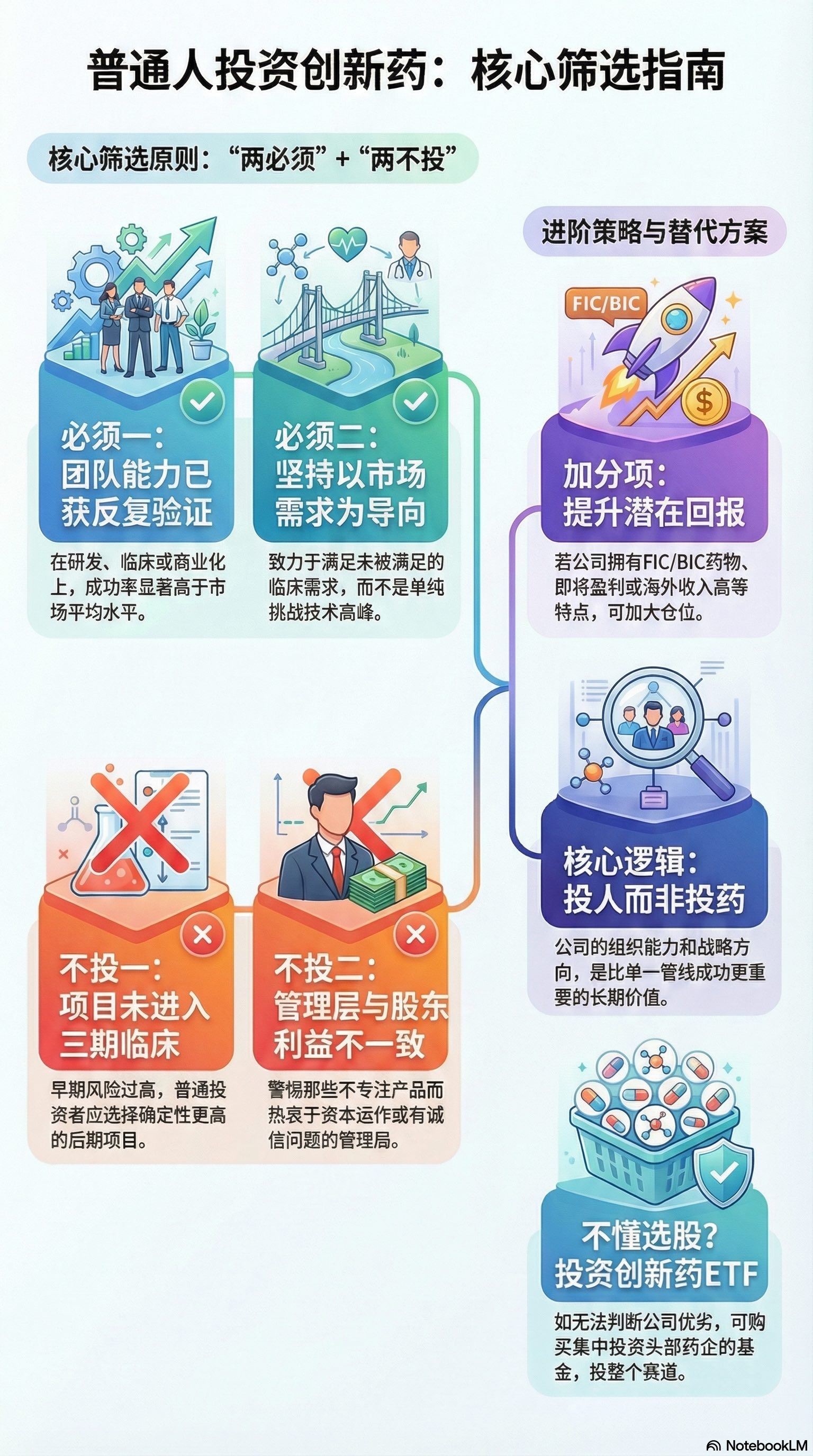 那我们作为普通投资者,如何判断这个创新药企的团队行不行呢?或者说,满足什么条件才适合重仓呢,分享一下我的思路,两必须+两不投: