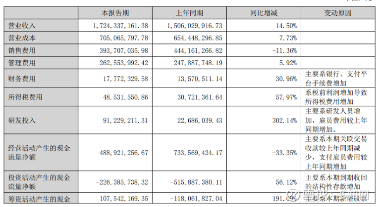 研发投入9122.92万元,同比增长302.14%。研发费用率为5.33%。主要系研发人员增加,雇员费用较上年同期增加。