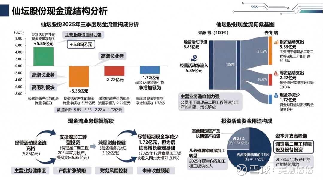 三季度现金及现金等价物净减少1.72亿,核心原因是投资活动净流出5.35亿(调理品二期工程等深加工产能扩建)+筹资活动净流出2.22亿(偿还债务/股东分红)。看似现金减少,实则是公司主动选择:用当下的现金投入,换未来深加工业务的高增长,这是典型的“先苦后甜”的成长股逻辑。