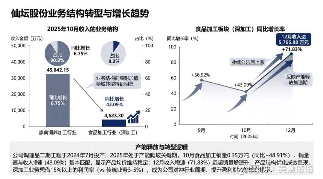 仙坛股份的本质是**“养殖筑底、食品突围”**:传统养殖业务是安全垫,深加工+出口业务是成长弹性,随着调理品产能全面释放、出口业务持续高增长,公司有望完成从“周期股”到“消费品股”的属性切换,估值重构的空间巨大。
