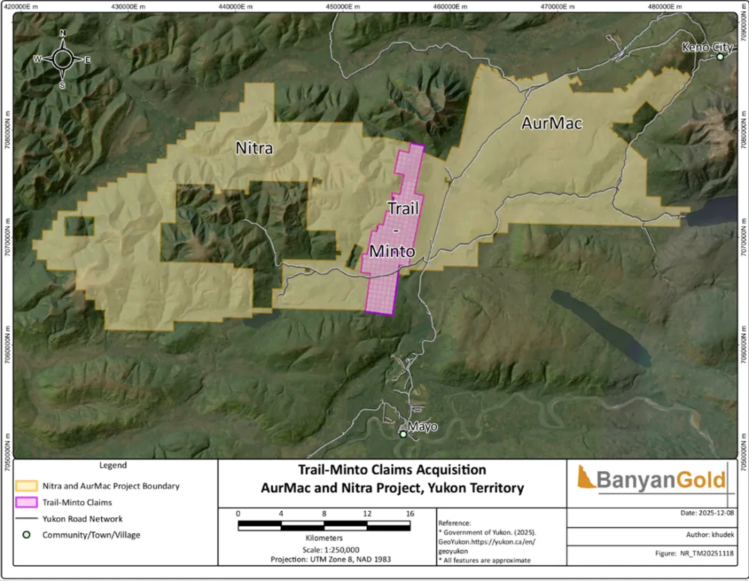 卑诗省温哥华 / ACCESS Newswire / 2025年12月17日 / Banyan Gold Corp. (“本公司”或“Banyan”) (TSXV:BYN)(OTCQB:BYAGF)欣然宣布,本公司已从Mayo Lake Minerals Inc.战略性收购了位于其AurMac项目和Nitra项目区之间的Trail Minto矿区,完成了围绕AurMac项目区近720平方公里的区域整合。