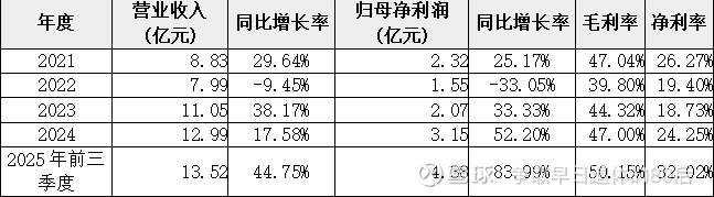 财务表现:公司近年业绩呈现高速增长态势。2021-2024年营收分别为8.83亿元、7.99亿元、11.05亿元和12.99亿元,归母净利润分别为2.32亿元、1.55亿元、2.07亿元和3.15亿元。2025年前三季度营收13.52亿元,同比增长44.75%;归母净利润4.38亿元,同比增长83.99%,全年预计净利润5.0-5.5亿元,同比增长58.83%-74.71%。