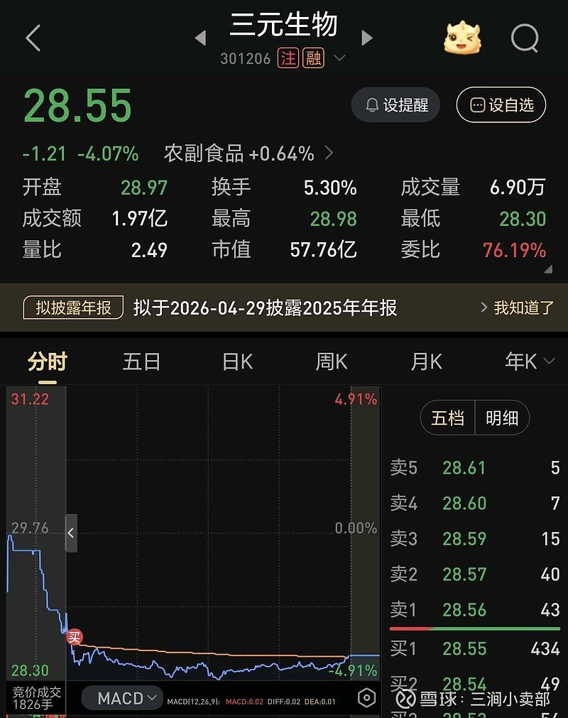 $三元生物(SZ301206)$ 今天加仓三元生物。可以理解为昨天是第二次试盘,从效果来看,经过1月30日的试盘再洗,抛压明显减轻,而且量能放大,可以简单理解为底部异动,如果接下来几天时间里量能能持续,那大概率是准备上攻了。