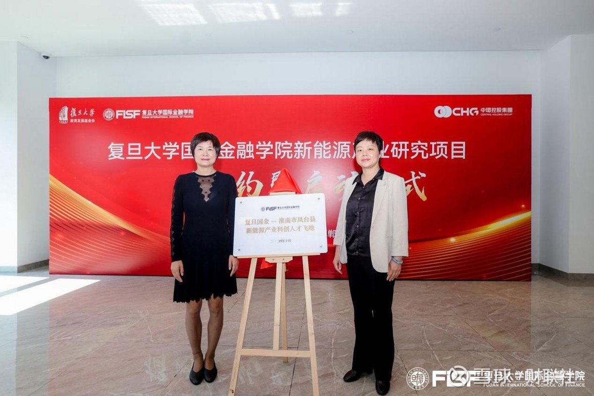 图|安徽省淮南市凤台县委常委、县委组织部部长时洪娟,复旦大学国际金融学院外联发展主任李元红为“复旦国金—淮南市凤台县新能源产业科创人才飞地”揭牌