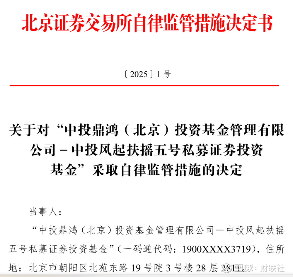 北交所官网显示,3月17日发出关于对中投鼎鸿(北京)投资基金-中投风起扶摇五号私募基金、华睿千和(天津)资管-华睿千和量化中性二号私募基金采取自律监管措施的决定,上述2个产品账户被北交所罚限制证券账户交易1个月。