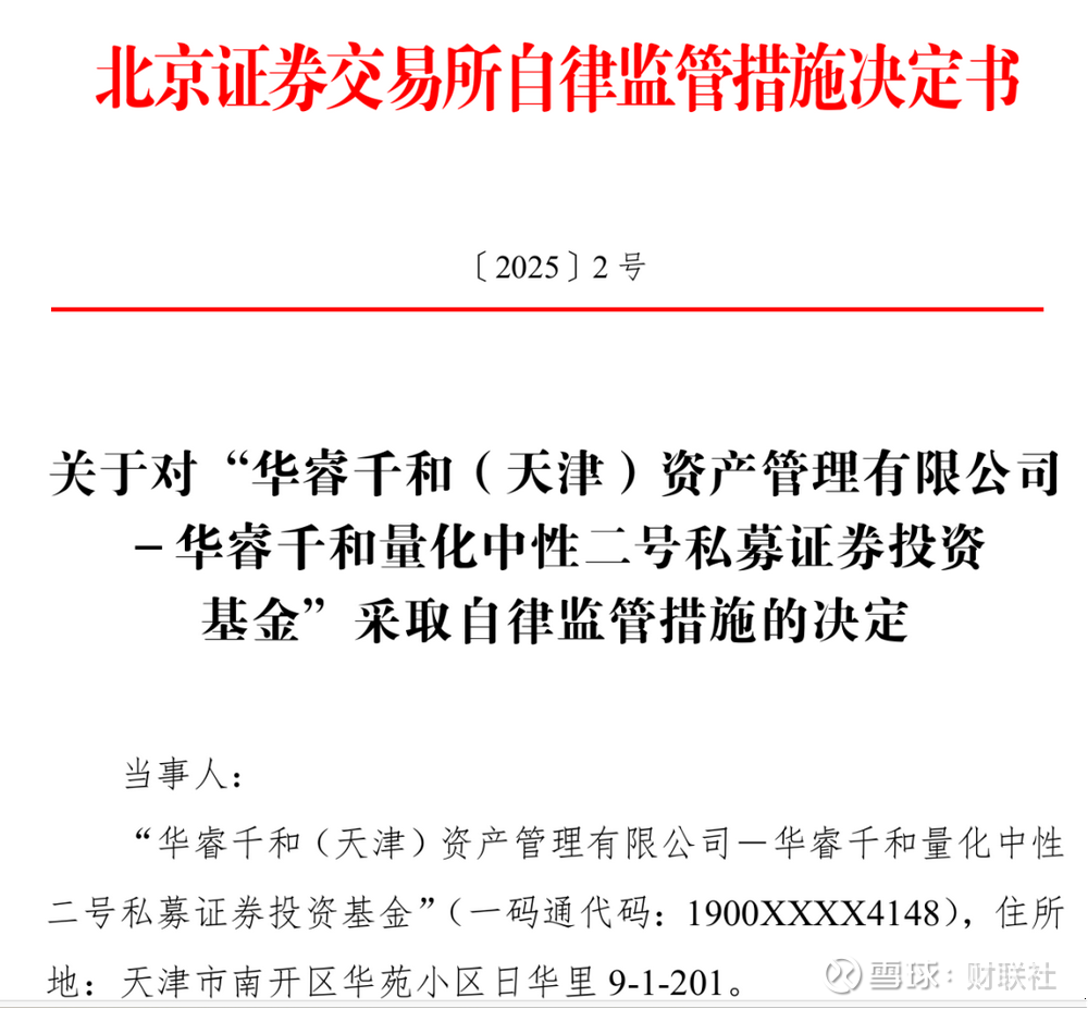 罚单情况来看,两家私募并非“初犯”。北交所表示,华睿千和(天津)资管曾因异常交易于2024年10月9日、2024年10月30日、2024年10月31日、2024年11月7日被采取监管关注、出具警示函、暂停证券账户交易等自律监管措施。