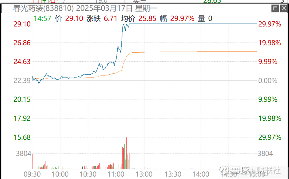 从盘面来看,春光药装在3月17日11点左右出现盘中异动,短短十分钟的时间则触及涨停板,直到收盘仍收涨停,当天股价飙升至29.1元,涨幅30%。