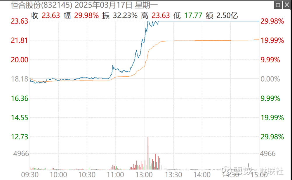 同样的,恒合股份也在当天下午开盘不久后成交量陡然攀升,股价也迅速向涨停板逼近,最终也收涨30%。
