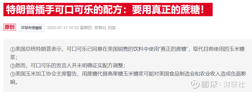 据央视新闻报道,美国总统特朗普周三(7月16日)在社交平台表示,可口可乐公司已同意在美国使用真正的蔗糖生产可乐。