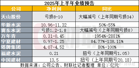其中,福建水泥、中国建材实现扭亏为盈,天山股份、冀东水泥大幅减亏,华新水泥、万年青(000789.SZ)、宁夏建材(600449.SH)、塔牌集团(002233.SZ)净利润均预计实现同比50%以上增幅。