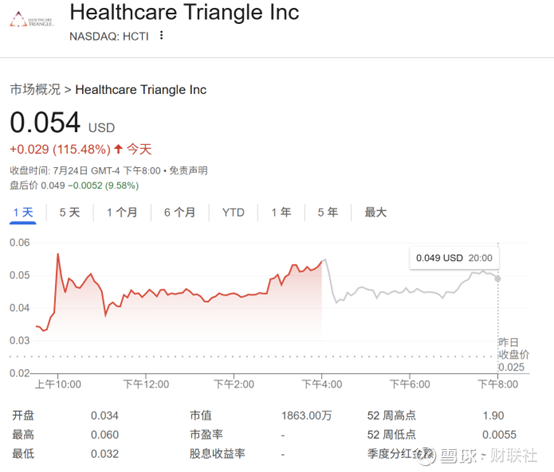 Healthcare Triangle Inc.的股价开盘一度飙升138%,截至收盘上涨115%。然而当天并没有任何明显的利好刺激这一令人瞠目的大涨。