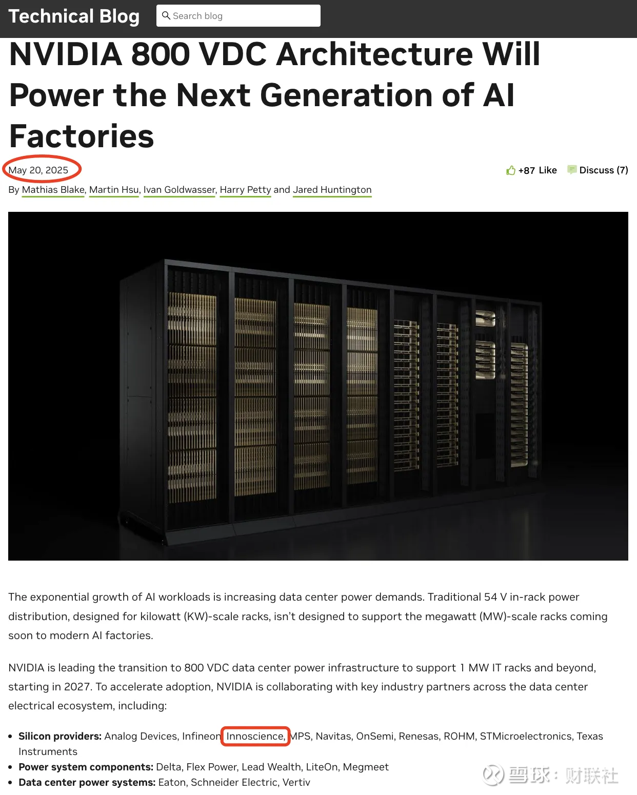 据英伟达官网,一篇2025年5月20日发布的与800V架构相关的技术博客中,提到了该方案的半导体供应商。除英诺赛科外,还包括英飞凌、德州仪器、瑞萨电子等行业领军企业。