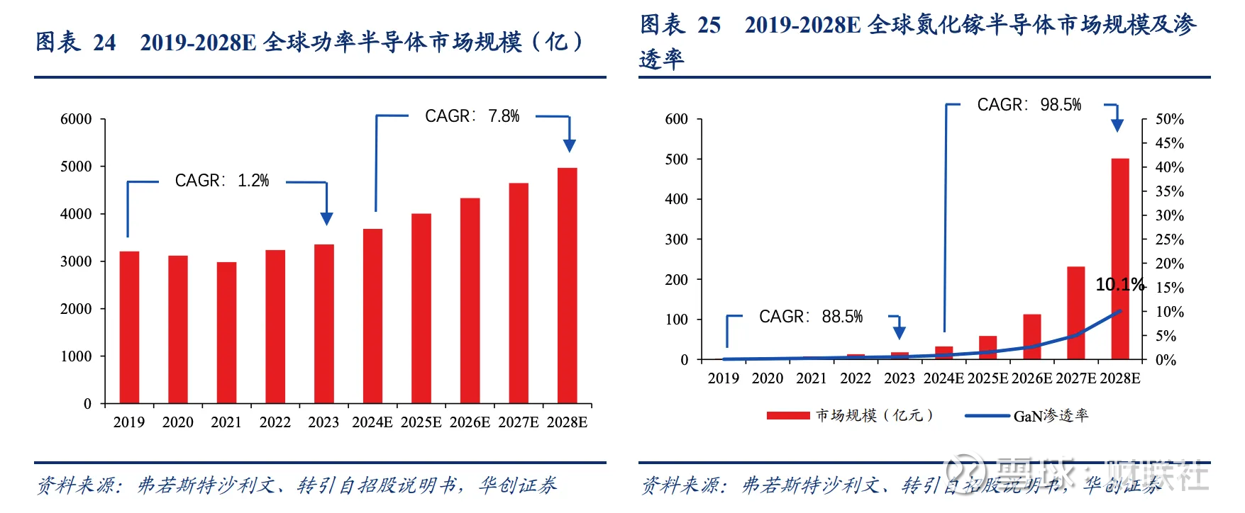 2023年全球GaN功率半导体市场规模约18亿元,仅占功率半导体整体市场的0.5%。据弗若斯特沙利文预测,2024-2028年GaN功率半导体市场规模年复合增速将达98%,2028年全球规模或突破500亿元,占功率半导体份额跃升至10.1%,十年内市场实现超二十倍扩容。