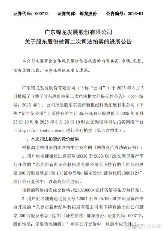 二是这部分股权是新世纪公司持有的锦龙股份部分股权,占所持股份比例16.59%、占锦龙股份总股本比例3.91%,且为非限售股。如果拍卖成功,也不会改变新世纪公司的股东地位,新世纪公司仍为公司控股股东,杨志茂仍为公司实际控制人,公司控股股东和实际控制人不会发生变化。锦龙股份称,本次成交的拍卖股份预计不会对公司的经营管理产生重大影响。