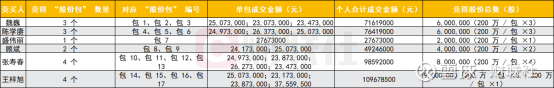 魏巍:以3个竞买号(Q8338、A2054、Y0597)拿下“包1”至“包3”,合计600万股(3个200万标的),成交金额7161.9万元,每股成本约11.94元,为所有竞买人中每股成本最低者;