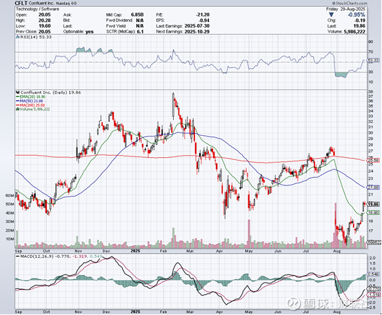 截至2025年8月底,Confluent股价约19美元,对应TTM市值约68.5亿美元,过去12个月营收为10.65亿美元,对应TTM P/S约5.3倍。