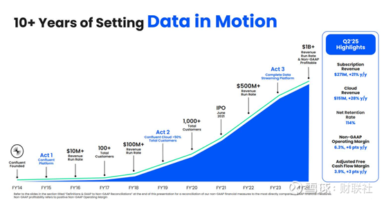 截至2025年,Confluent拥有超过4,500家活跃客户,包括Netflix、Airbnb、沃尔玛、Citigroup等知名企业,客户覆盖金融、零售、科技、能源、政府等多个行业。公司过去五年收入保持高速增长,2024财年营收突破10亿美元,已成为全球数据流平台领域的绝对龙头。