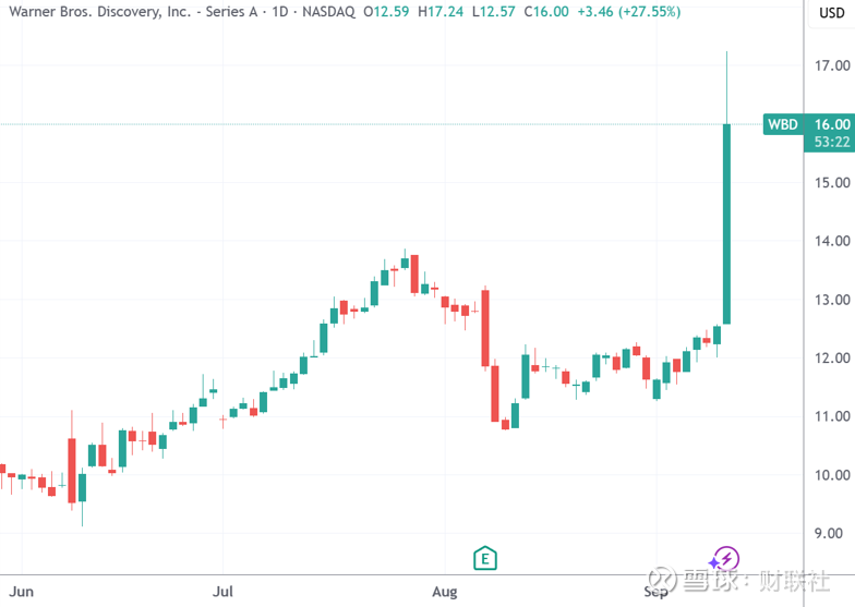 财联社9月12日讯(编辑 史正丞)美股周四盘中,美国大型媒体集团华纳兄弟探索公司股价异动拉升,一度涨超30%。市场消息称,上个月才刚完成派拉蒙并购交易的埃里森家族,将财大气粗地发起另一项巨额收购交易。