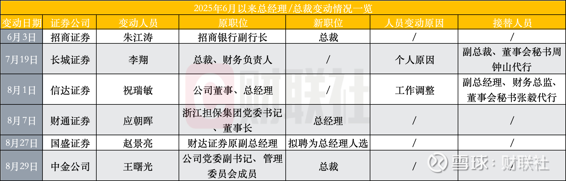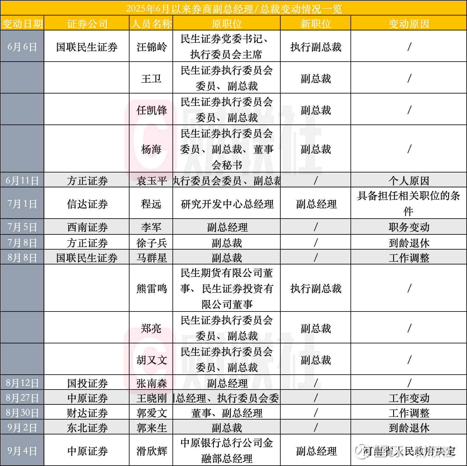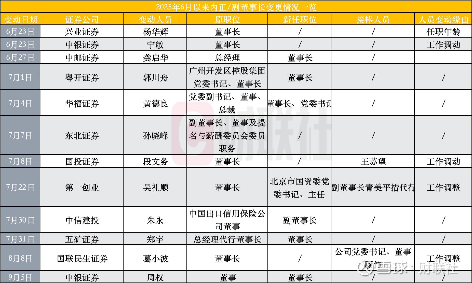 6月至今,至少已有11家券商董事长出现调整。