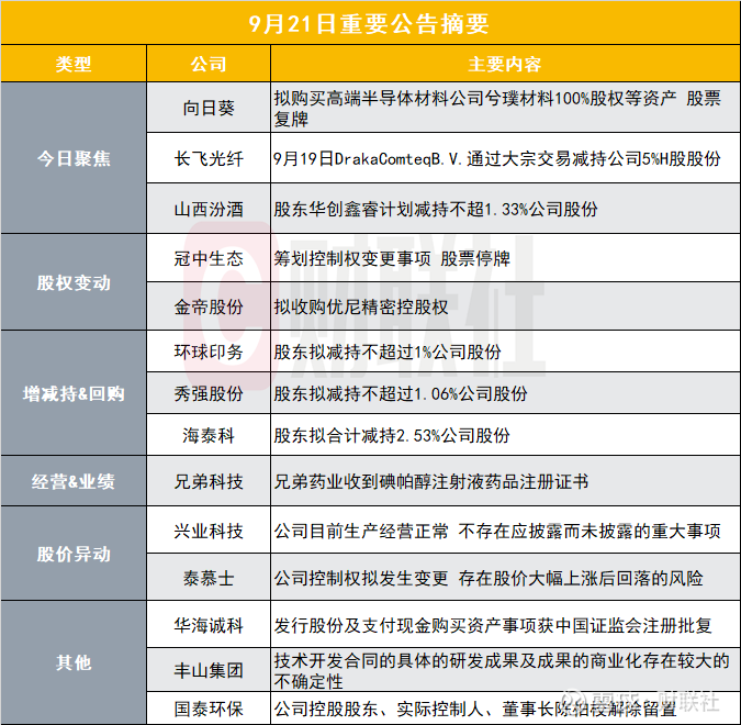 向日葵(300111.SZ)公告称,公司拟以发行股份及支付现金的方式购买漳州兮璞材料科技有限公司100%股权、浙江贝得药业有限公司40%股权并募集配套资金。公司股票将于2025年9月22日复牌。兮璞材料主要从事高端半导体材料的研发、制造与销售,主要产品包括半导体级高纯度电子特气、硅基前驱体、金属基前驱体等,广泛应用于半导体制造过程中的扩散、蚀刻、薄膜沉积等关键工艺环节。贝得药业作为向日葵的控股子公司,主要从事抗感染类、心血管类、消化系统类等药物的研发、制造和销售。